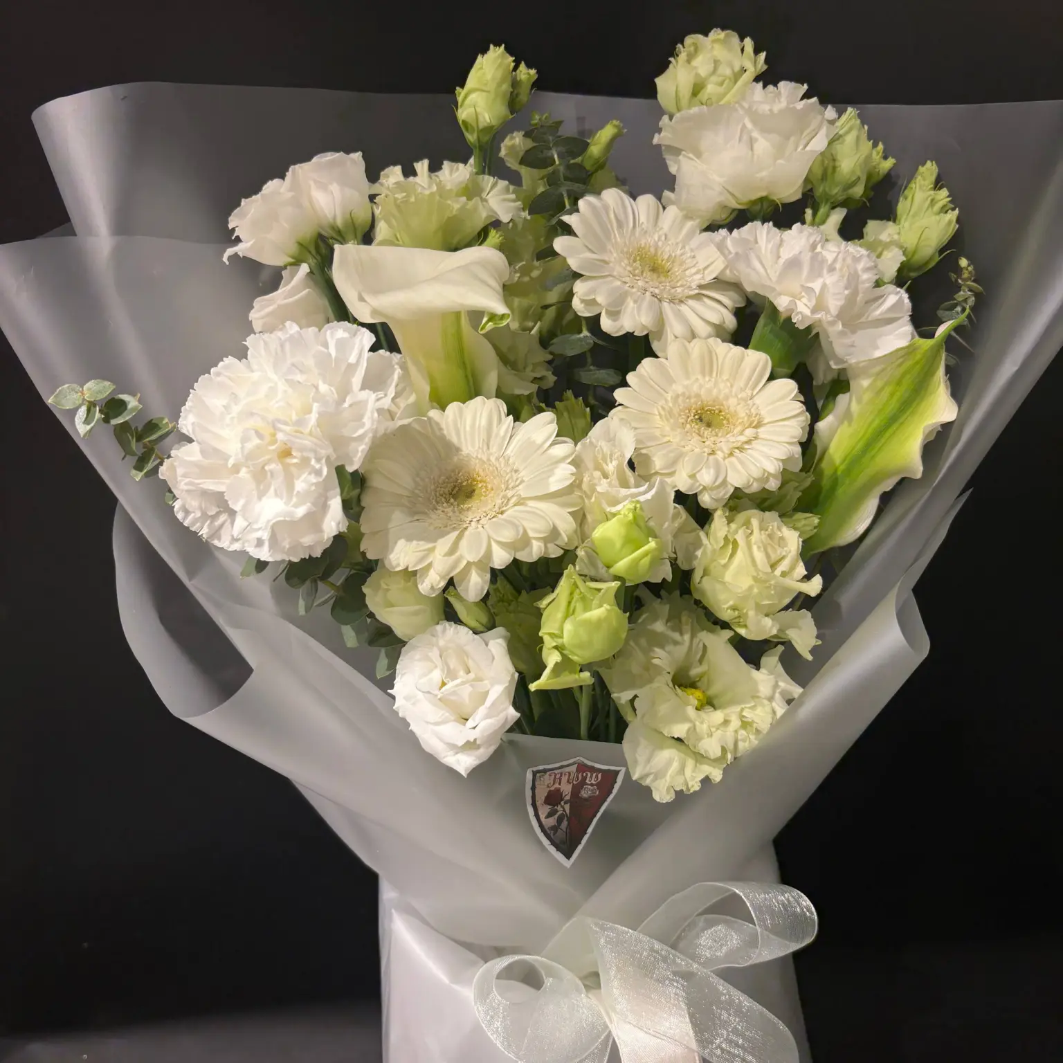 Авторський букет від RWW ART пасує для подарунка, привітання чи особливої події. У складі композиції поєднано Гвоздика Біла, Гербера міні, Евкаліпт Бебі Блу, Еустома (Фісташка) Голландія, Еустома біла Голландія, Калла біла Голландія та Фісташка.