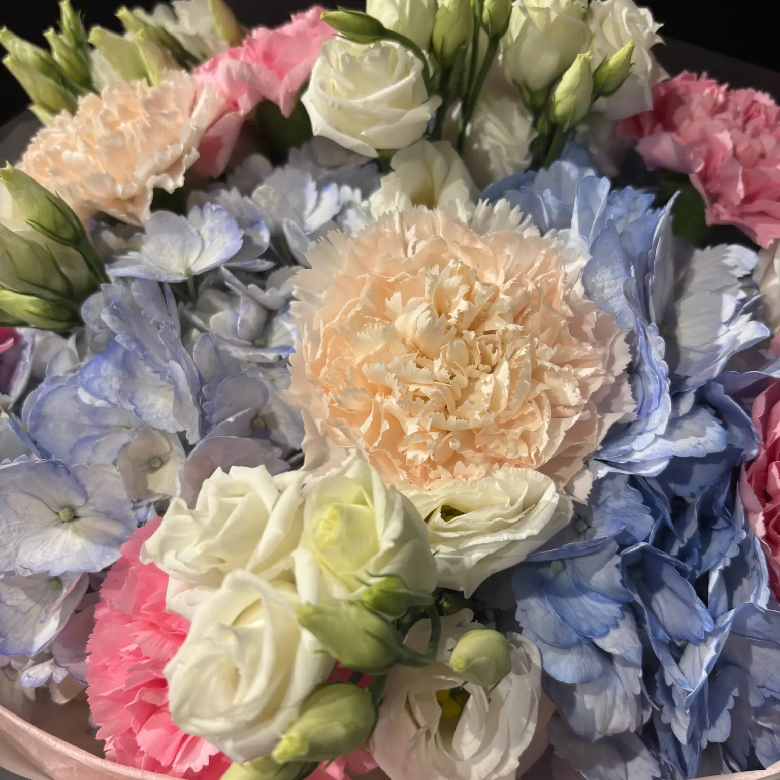 Авторський букет від RWW ART пасує для подарунка, привітання чи особливої події. У складі композиції поєднано Гвоздика Кремова, Гвоздика Рожева, Гортензія Екстра – Колумбія, Еустома біла Голландія та Фісташка.