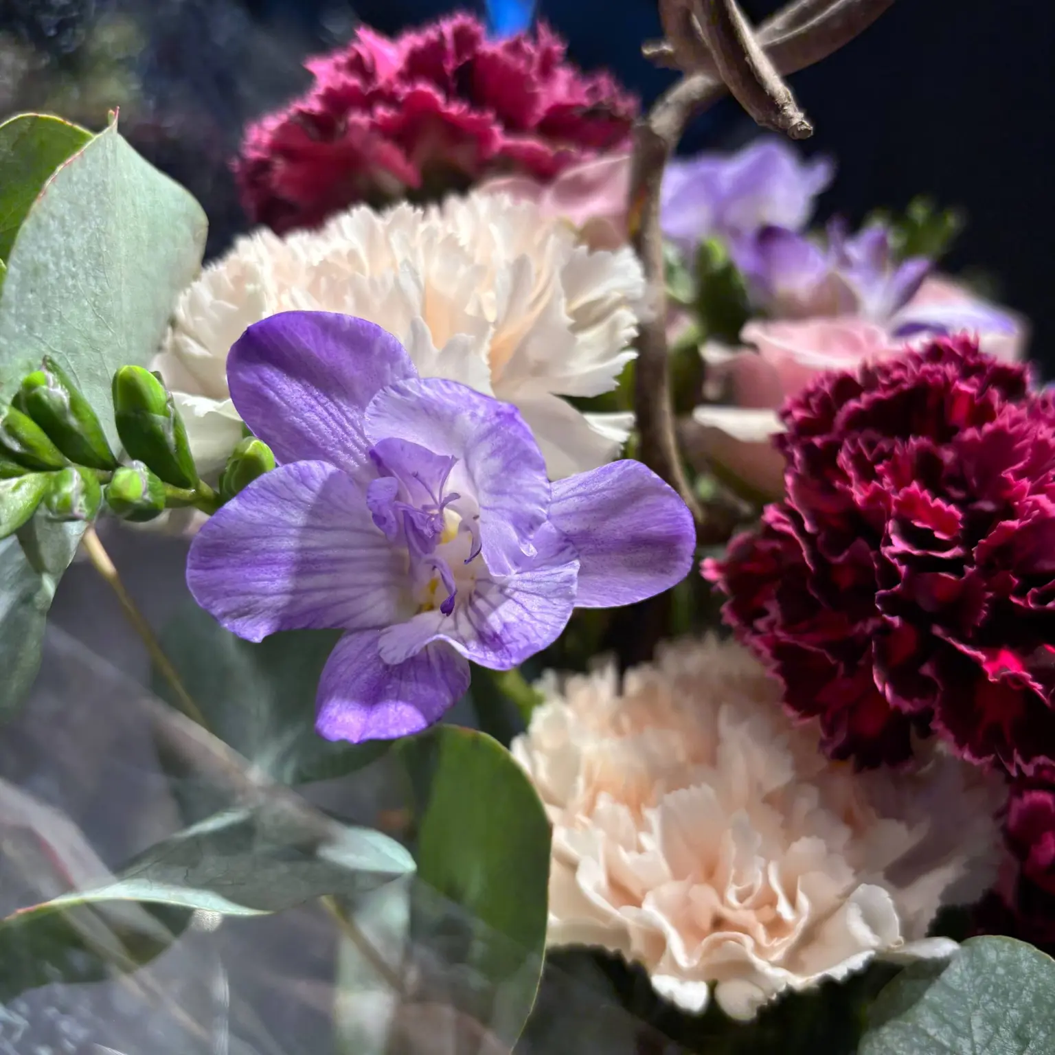 Авторський букет від RWW ART пасує для подарунка, привітання чи особливої події. У складі композиції поєднано Гвоздика Кремова, Гвоздика фіолетова – Голландія, Евкаліпт Сінерея – Еквадор, Троянда спрей Лейла 75 см Асканія та Фрезія біла.