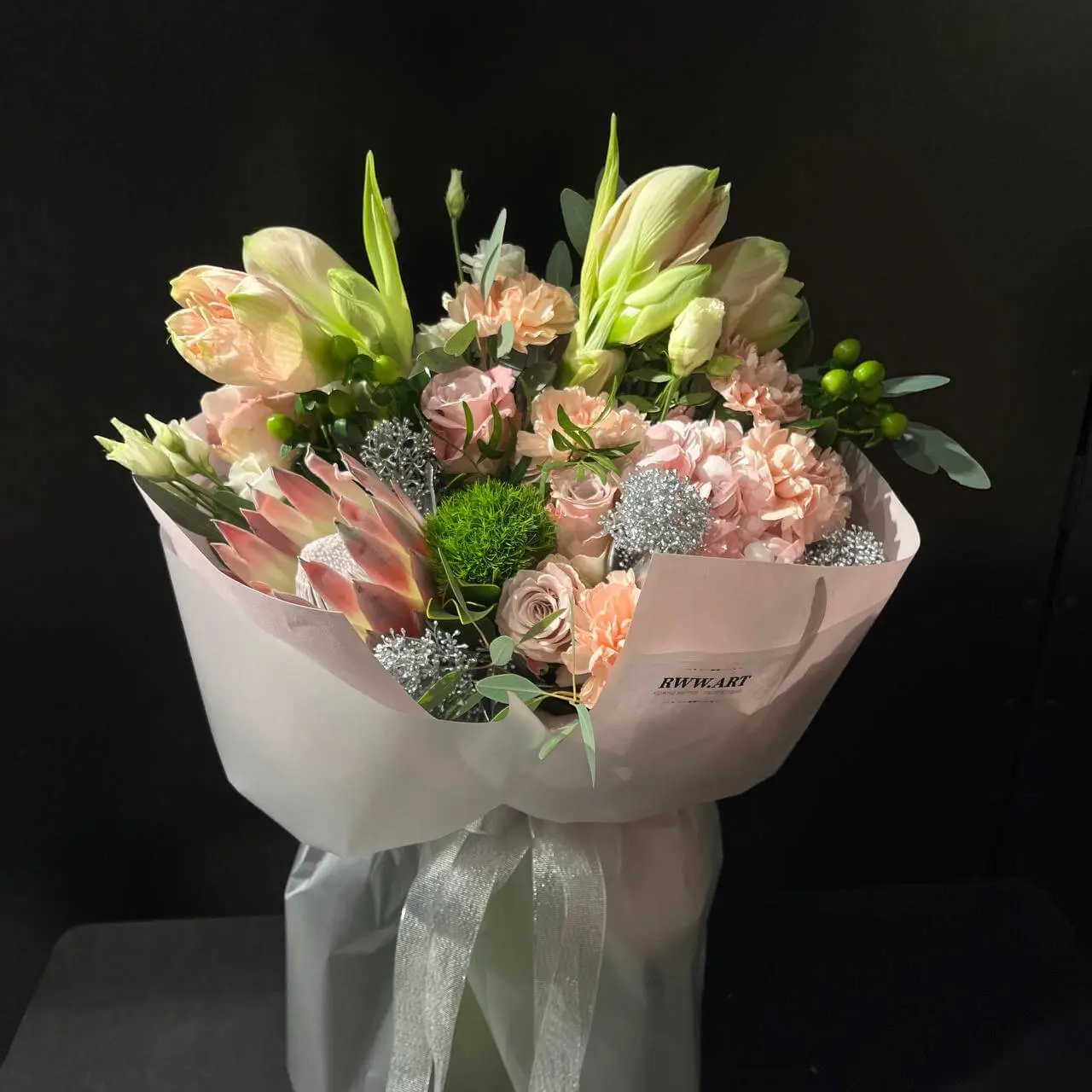- Склад: Протея, амариліс червоний, скімія фарбована, діантус, гортензія, хіперікум червоний, фісташка, гвоздика рожева, еустома ніжно-рожева, троянди Кімберлі.