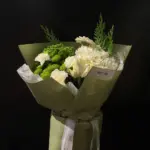 - Склад: Пакування M — 1, гортензія (2), хризантема Код Грін (2), гербера міні (2), сухоцвіт Коніферен (2), троянда Аваланш (2), гвоздика біла (3)