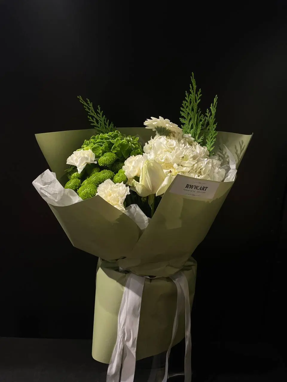Букет №56 випромінює природну ніжність і врівноважений спокій. М’які лінії білої гортензії поєднуються з тендітними гвоздиками, трояндами Аваланш та мінігерберами, утворюючи відчуття гармонії. Зелена хризантема додає свіжості, а сухоцвіти в бежевих тонах надають композиції теплоти.