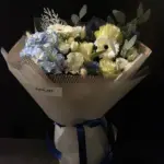 Цей букет випромінює ніжність і врівноважений шарм — поєднання білих троянд Мондіаль, кремових гвоздик, еустом, гортензії та витончених сухоцвітів лагурусу й коніферену дарує відчуття спокою і легкості. Сріблясто-зелена палітра створює враження ранкового світла, що лягає на прозоре скло.