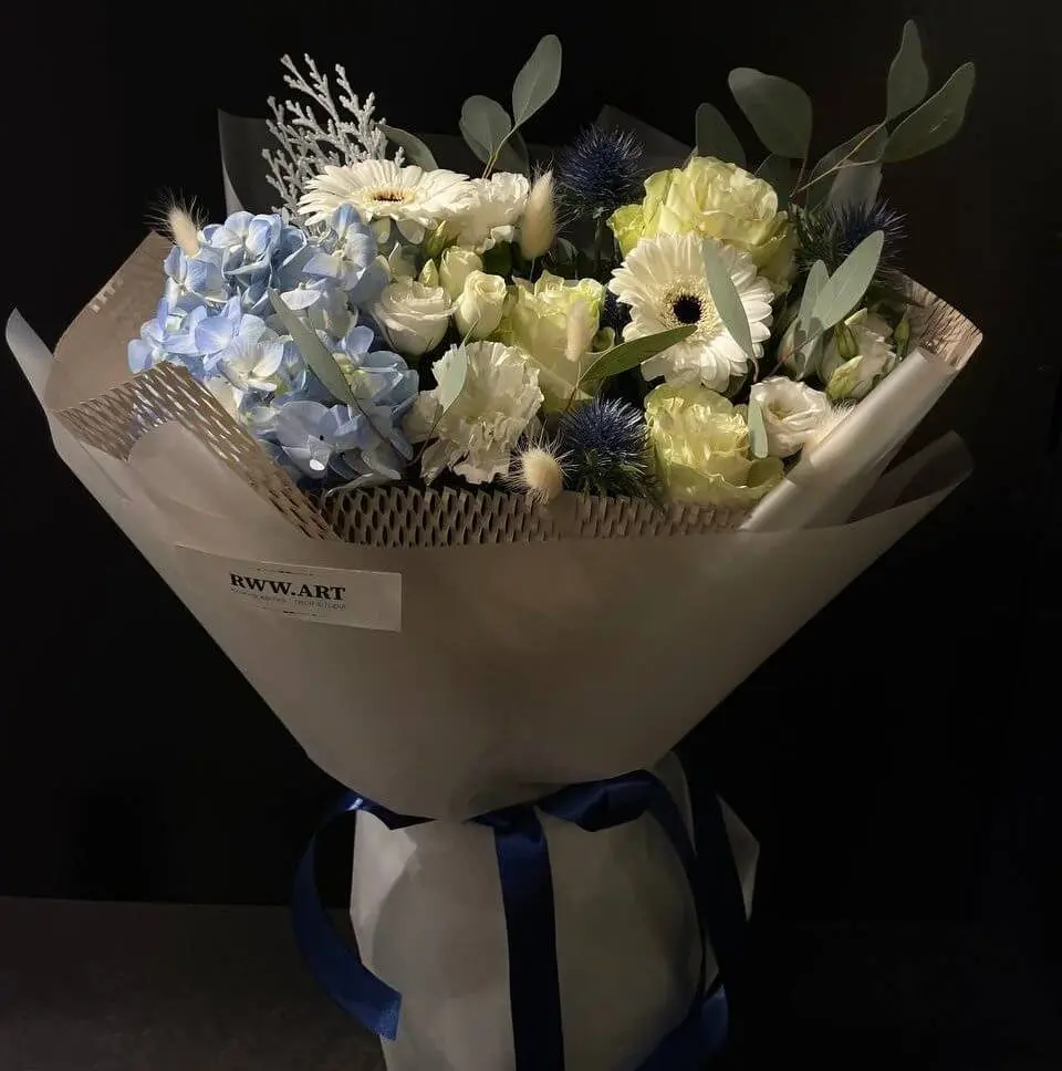 - Склад: Гербера міні (2), сухоцвіт коніферен (2), ерінгіум (1), троянда біла Мондіаль 80 см (3), гортензія (1), сухоцвіт лагурус кремовий (5), фісташка (2), гвоздика біла (2), еустома біла Голландія (1), пакування M (1)