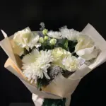 Букет №63 — це історія про делікатність і внутрішню гармонію. Поєднання білих троянд Мондіаль, гвоздик і хризантем нагадує ніжний танець світла й повітря. Сріблясте оформлення підкреслює стриману елегантність композиції, залишаючи враження чистоти й спокійної радості.