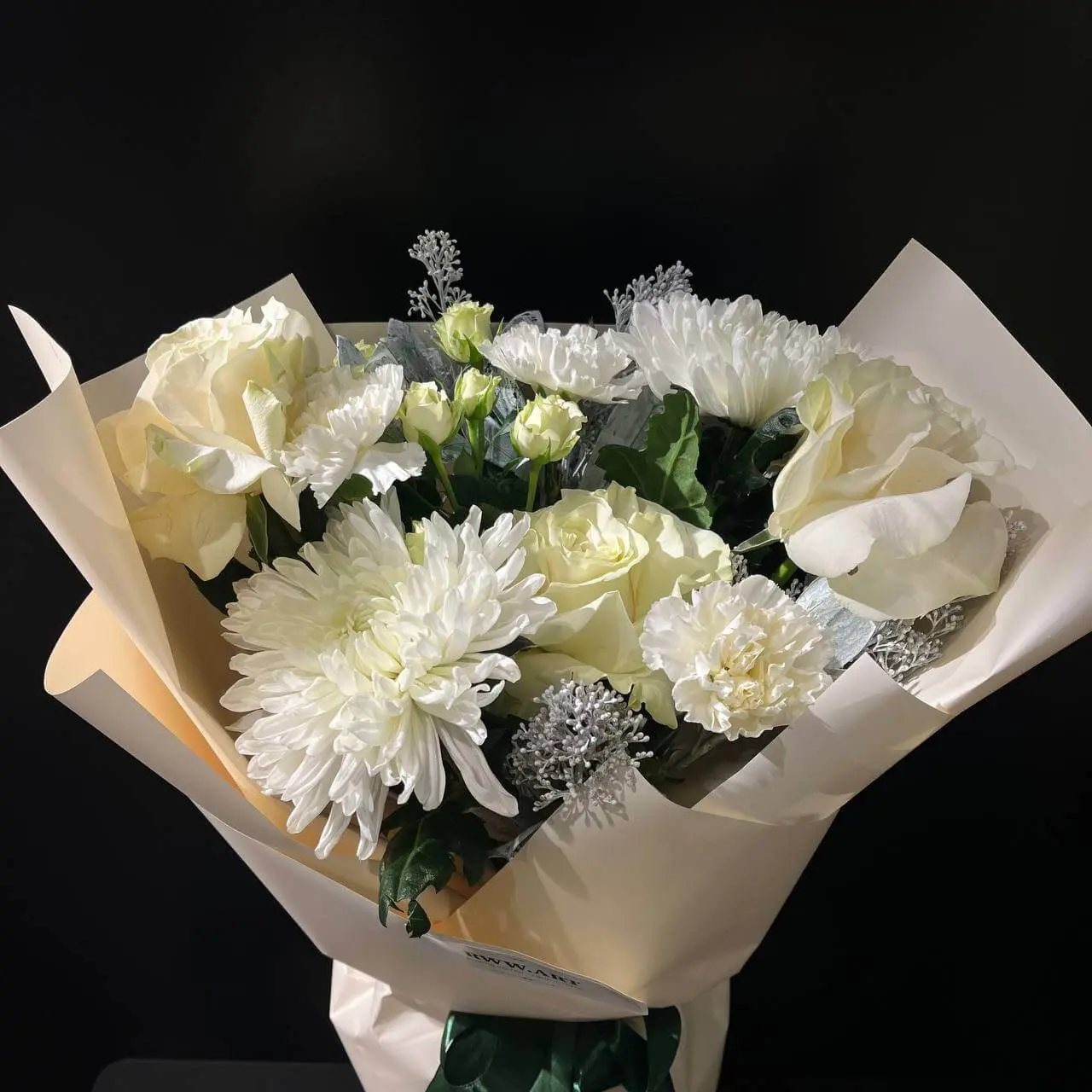 - Склад: троянда біла Мондіаль — 3 шт., скімія фарбована — 2 шт., хризантема Антонов біла — 2 шт., троянда спрей мікс — 1 шт., гвоздика біла — 3 шт., пакування M