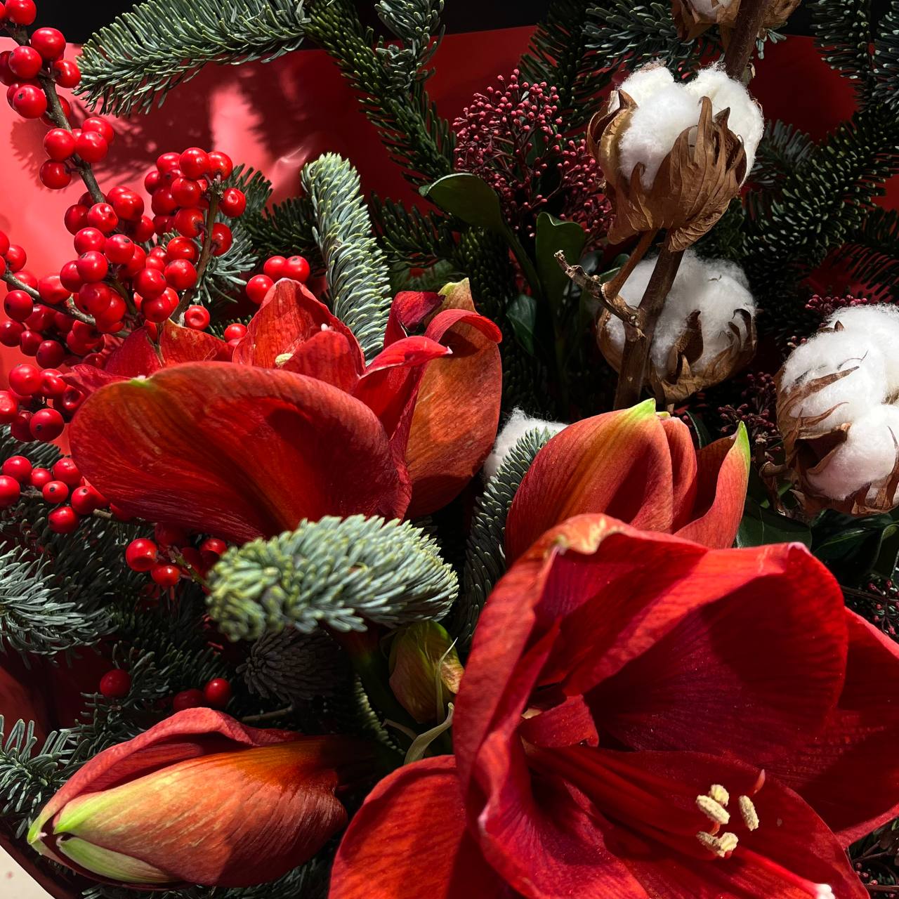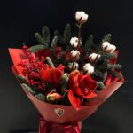 - Склад: Амариліс червоний — 1 шт., Ілекс червоний — 1 шт., Нобіліс — 2 шт., Бавовна натуральна — 2 шт., Скімія червона — 3 шт., Пакування M — 1 шт.