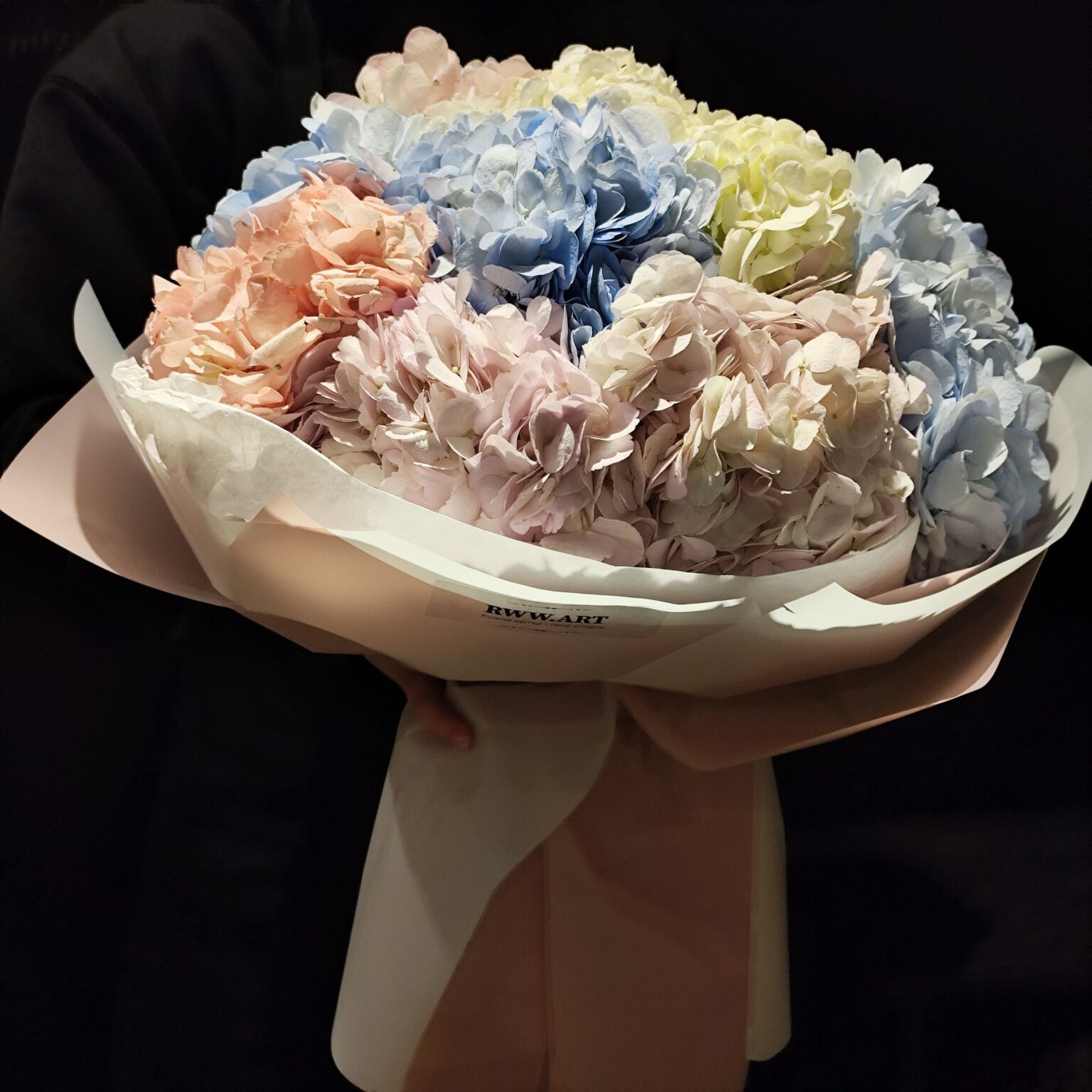 Букет з 11 гортензій мікс в упакуванні (колір гортензії може відрізнятися від фото).
