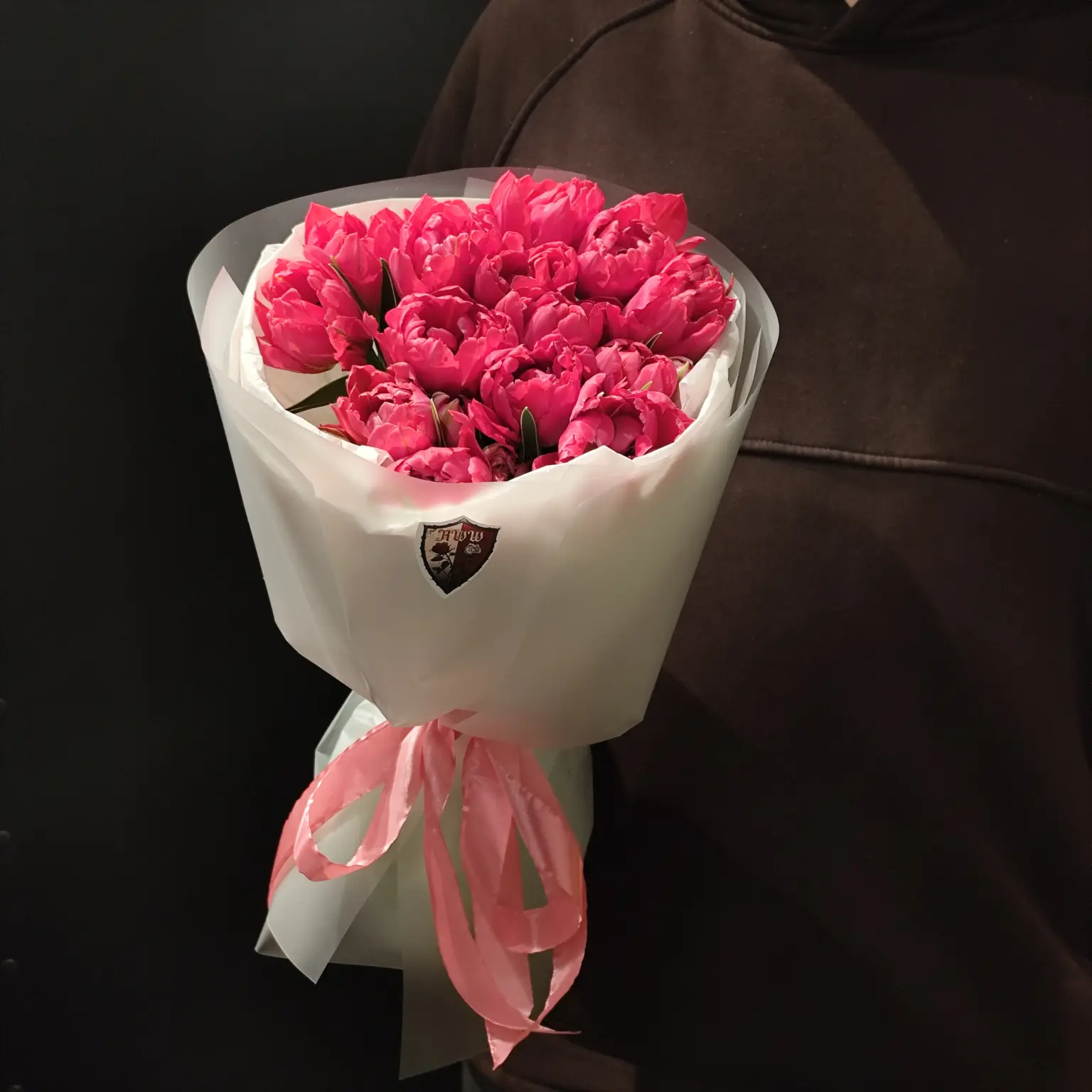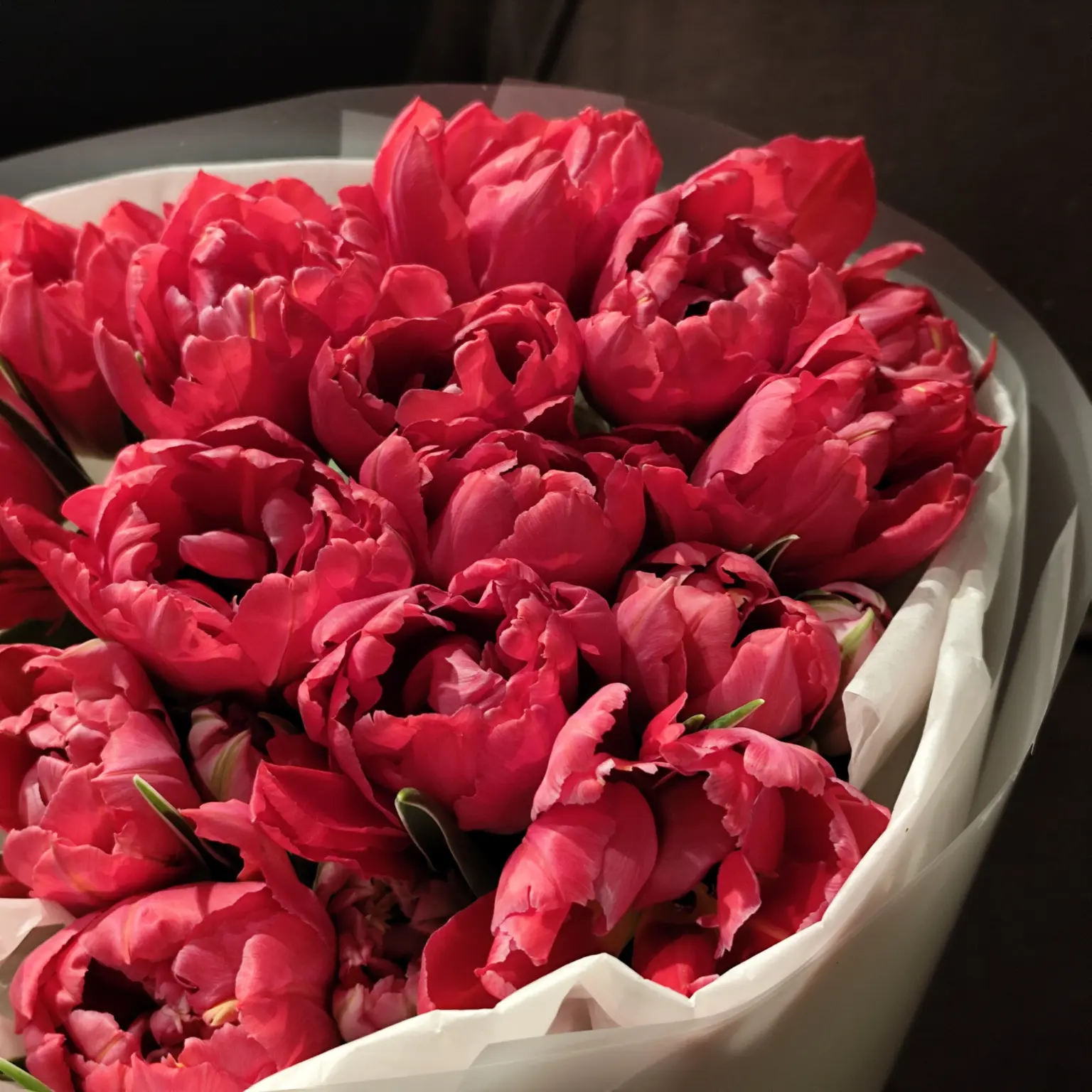 Букет з 15 червоних піоновидних тюльпанів