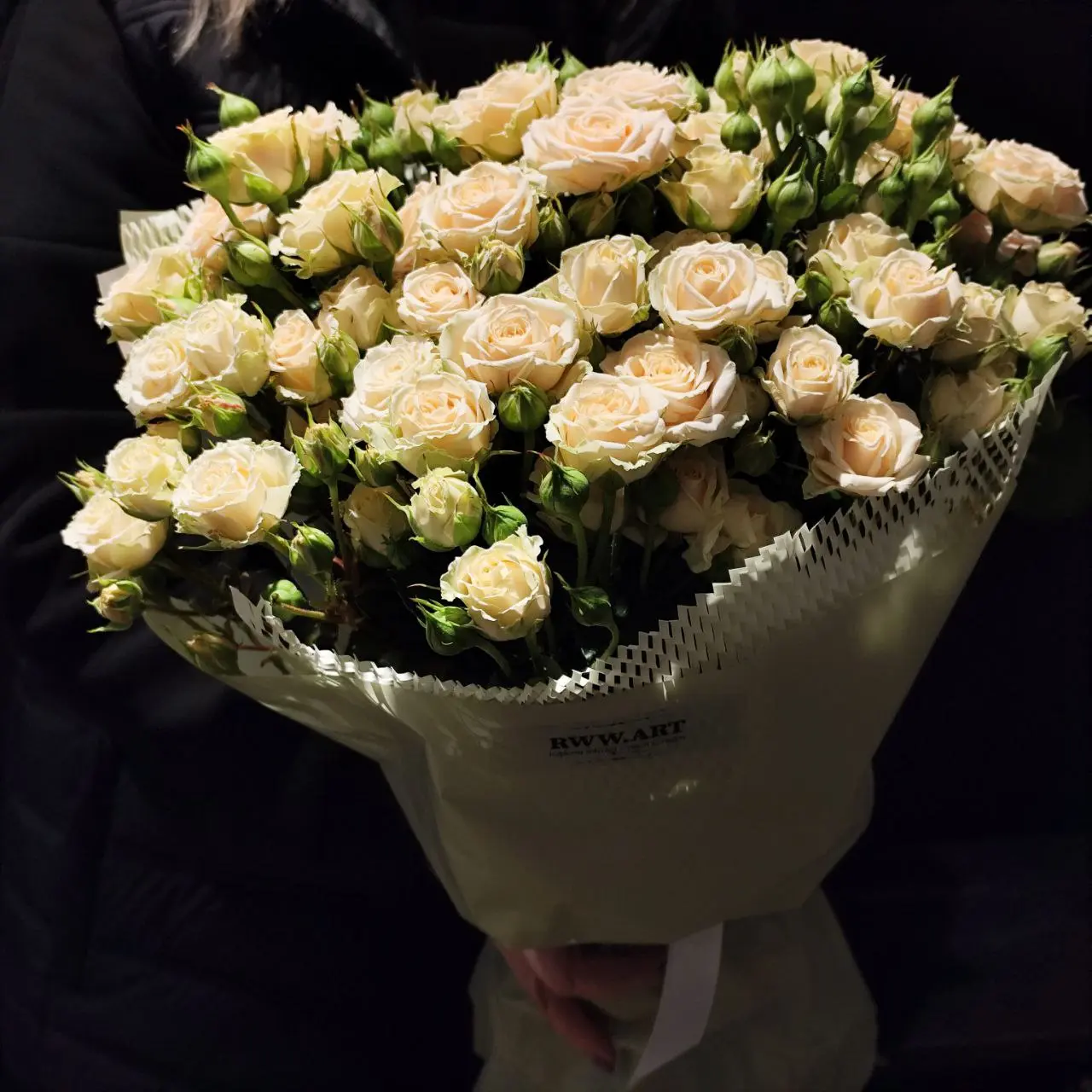 Цей букет створює атмосферу ніжності та делікатності. Кремові кущові троянди немов сором’язливо розкривають свої пелюстки, нагадуючи про щирість почуттів і гармонію моменту. Він виглядає природно, але водночас вишукано — саме тому легко пасує до будь-якого настрою чи події.