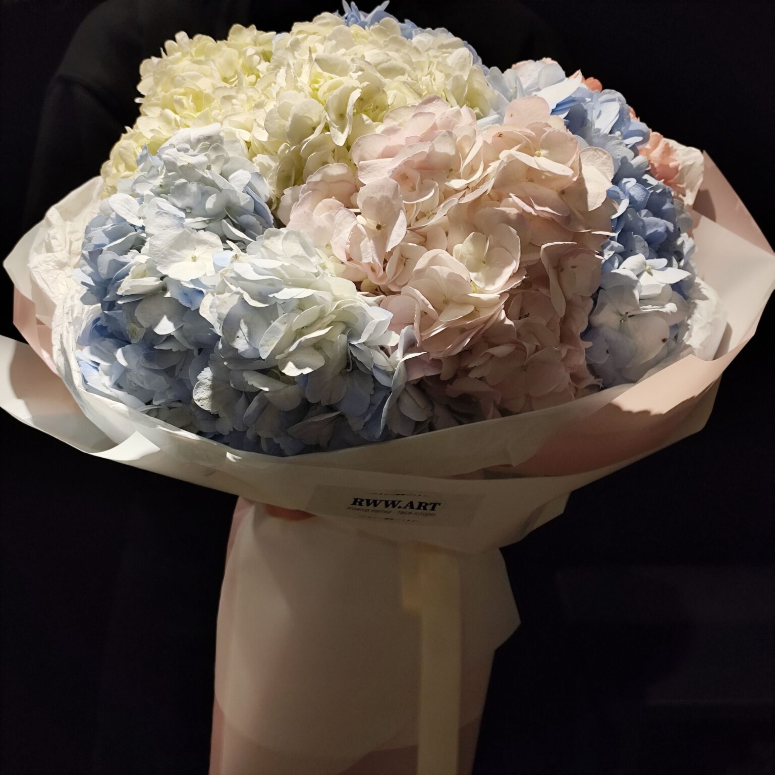 Букет з 9 гортензій мікс в упакуванні (колір гортензії може відрізнятися від фото).