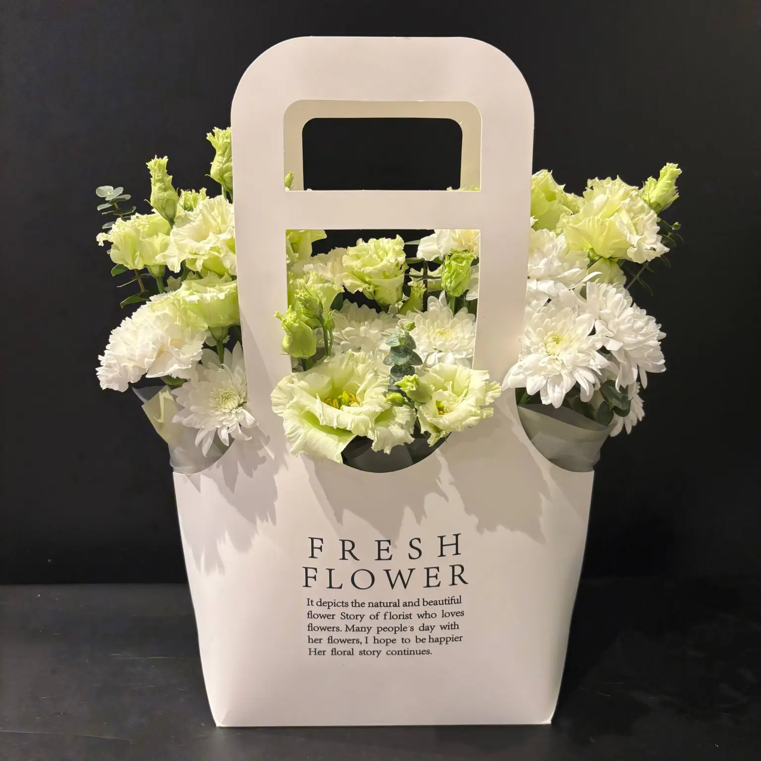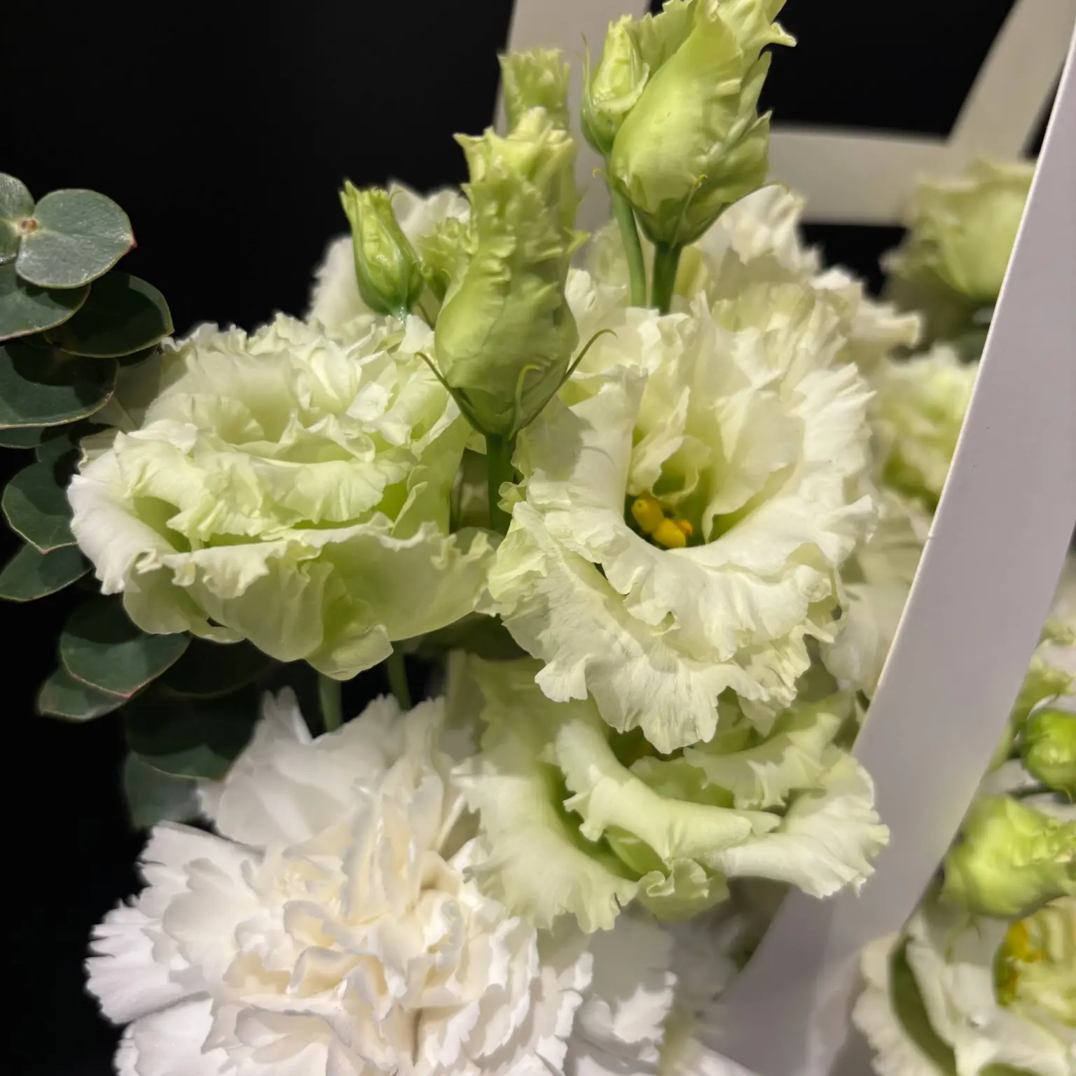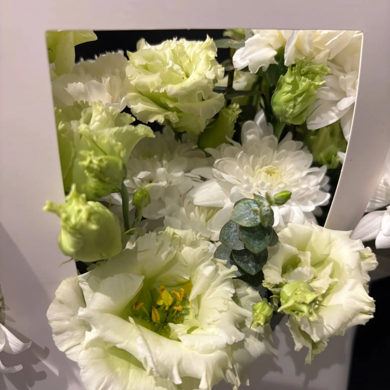 Авторський букет від RWW ART пасує для подарунка, привітання чи особливої події. У складі композиції поєднано Гвоздика Біла, Евкаліпт Бебі Блу, Еустома (Фісташка) Голландія, Сумка крафтова біла велика та Хризантема Балтіка, біла.