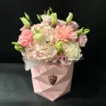 Авторський букет від RWW ART пасує для подарунка, привітання чи особливої події. У складі композиції поєднано Гвоздика Кремова, Гвоздика Рожева, Гортензія – Колумбія, Еустома ніжно-рожева Голландія та Коробка Багатогранна S, рожевий.