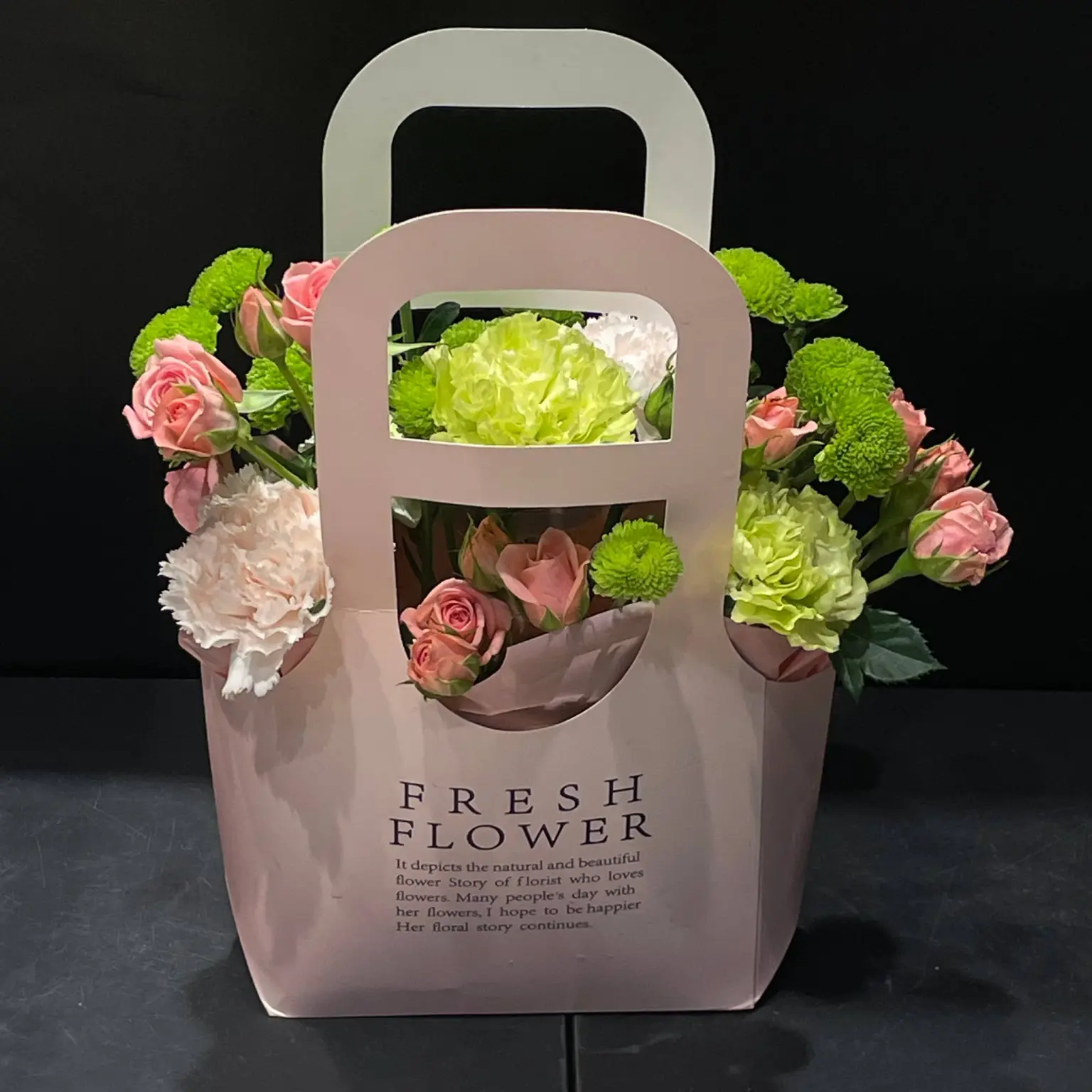 Авторський букет від RWW ART пасує для подарунка, привітання чи особливої події. У складі композиції поєднано Гвоздика Зелена, Гвоздика Кремова, Сумка крафтова маленька рожева, Троянда спрей Оділія 60 см Факт та Хризантема Код Грін, зелена.