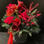 Композиція №64 – це поєднання яскравої енергії та стриманої елегантності. Оксамитова сірість коробки підкреслює глибокий червоний колір квітів, створюючи відчуття свята й урочистості. Композиція ніби переносить в атмосферу теплих емоцій і чарівного передчуття важливих моментів.