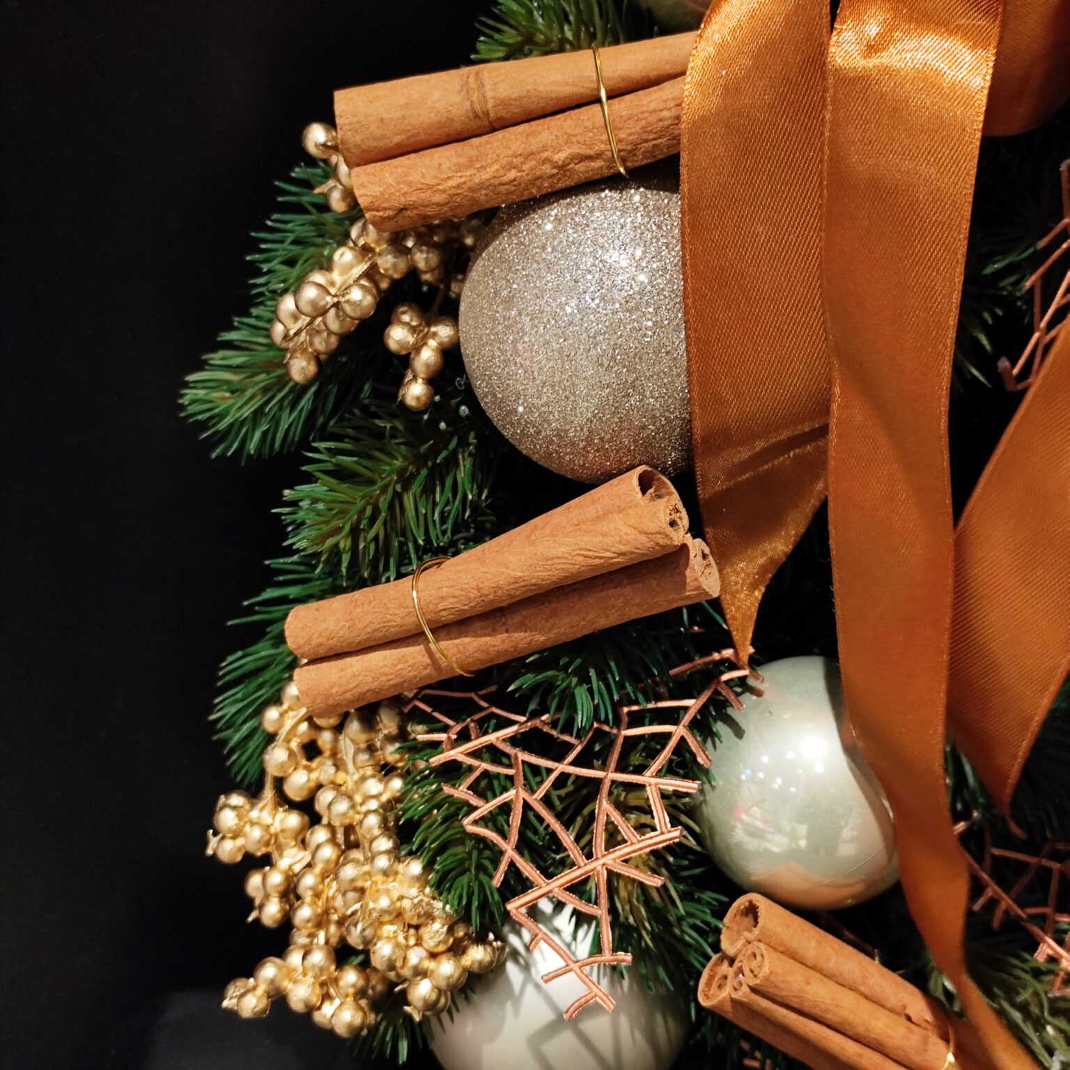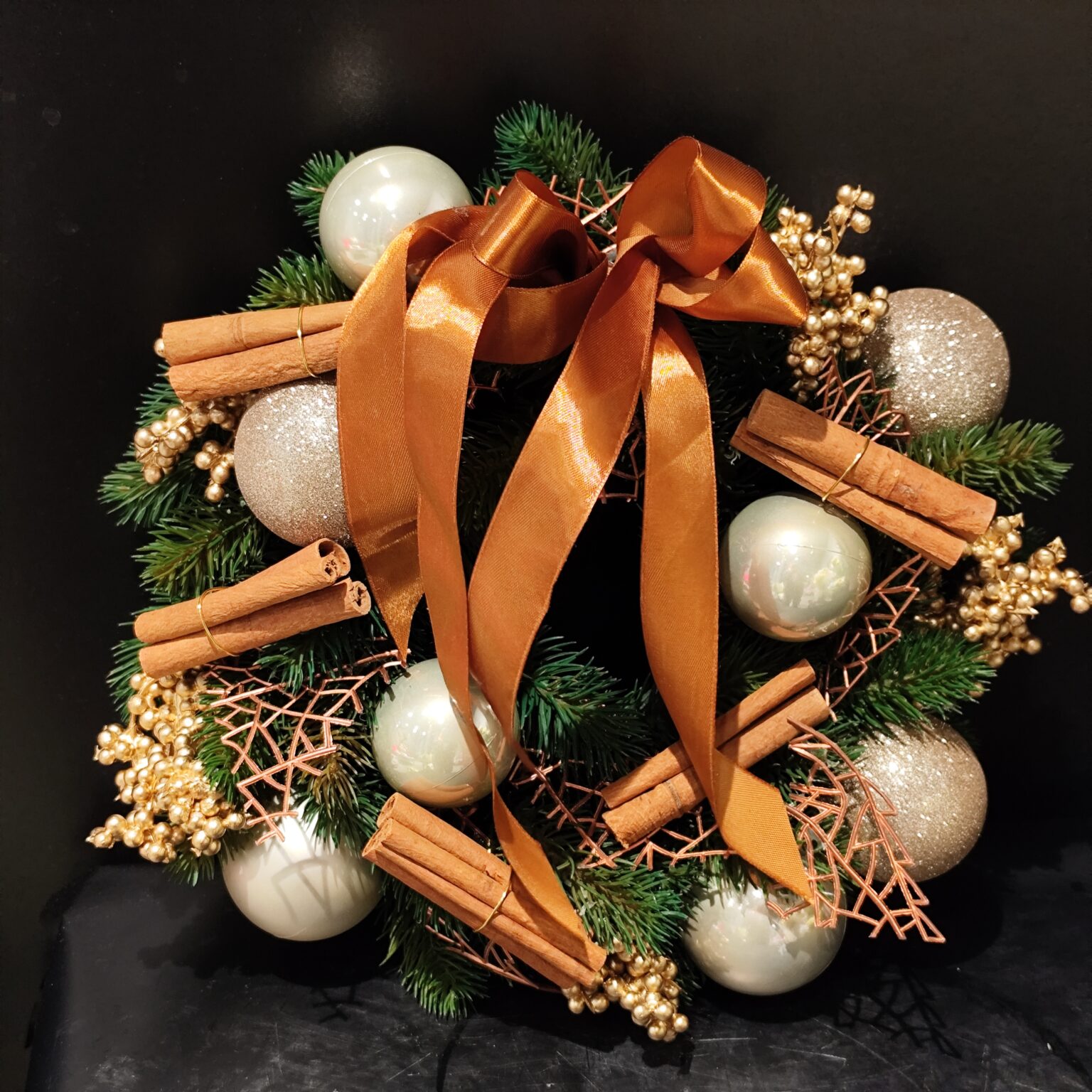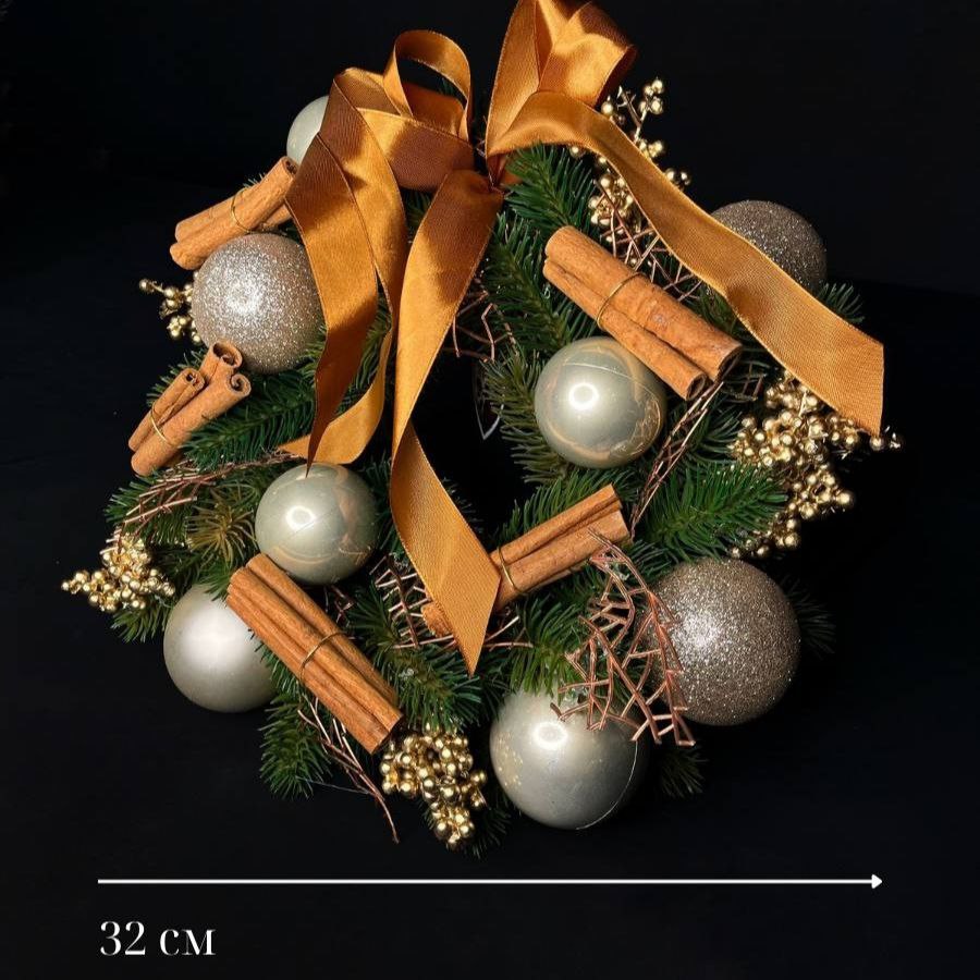 - Склад: Новорічний вінок з литої ялини зелений (1 шт.), калина насадка дрібна золота (5 шт.), новорічні кулі мікс 6 см (8 шт.), кориця 8 см (12 шт.)