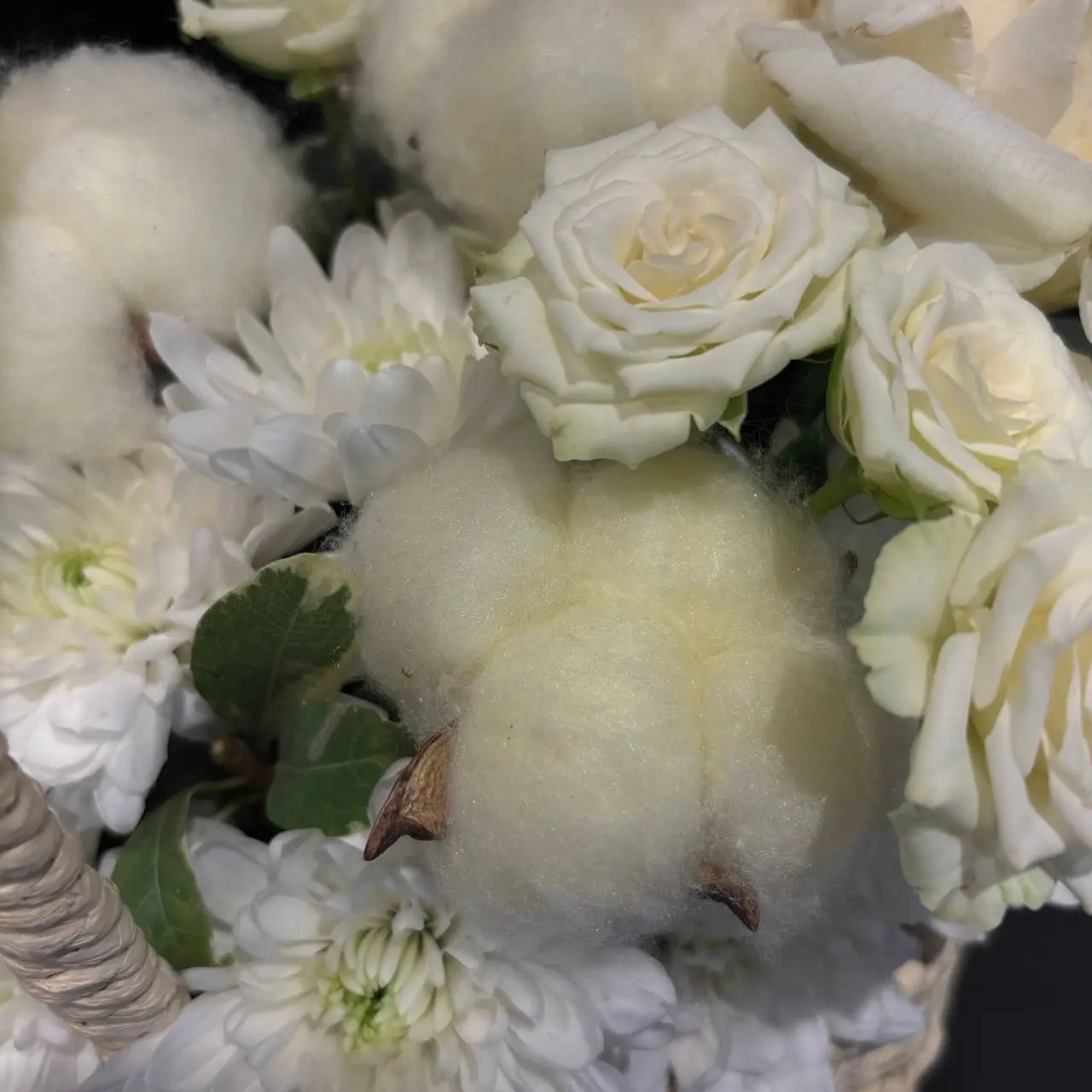 Авторський букет від RWW ART пасує для подарунка, привітання чи особливої події. У складі композиції поєднано Гвоздика Біла, Корзина бежева “flower” 21*12*27, Пітоспорум, Сухоцвіт Бавовна, біла, Троянда Спрей мікс – Голландія, Троянда біла Мондіаль, 50 см та Хризантема Балтіка, біла.
