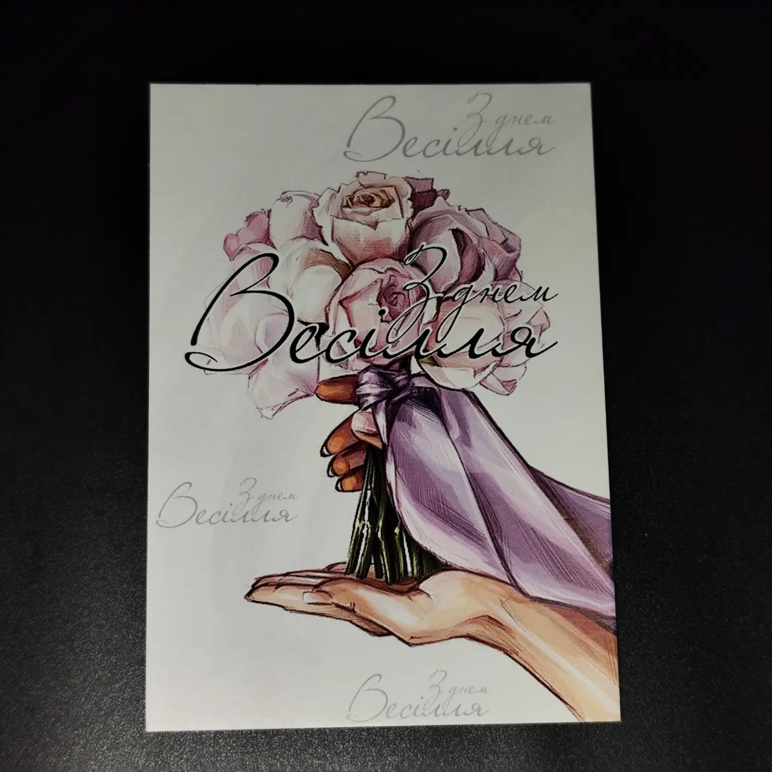 Листівка з плотного картону з надисом “З днем Весілля” розміром 10*7 см