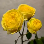 Піоні Баблз – унікальна троянда-спрей із півонієподібною формою бутона та насиченим жовтим кольором, який дарує відчуття тепла та позитиву. На одному стеблі розташовано кілька розкішних квіток, що плавно розкриваються, демонструючи багатошаровість і ніжну текстуру пелюсток.